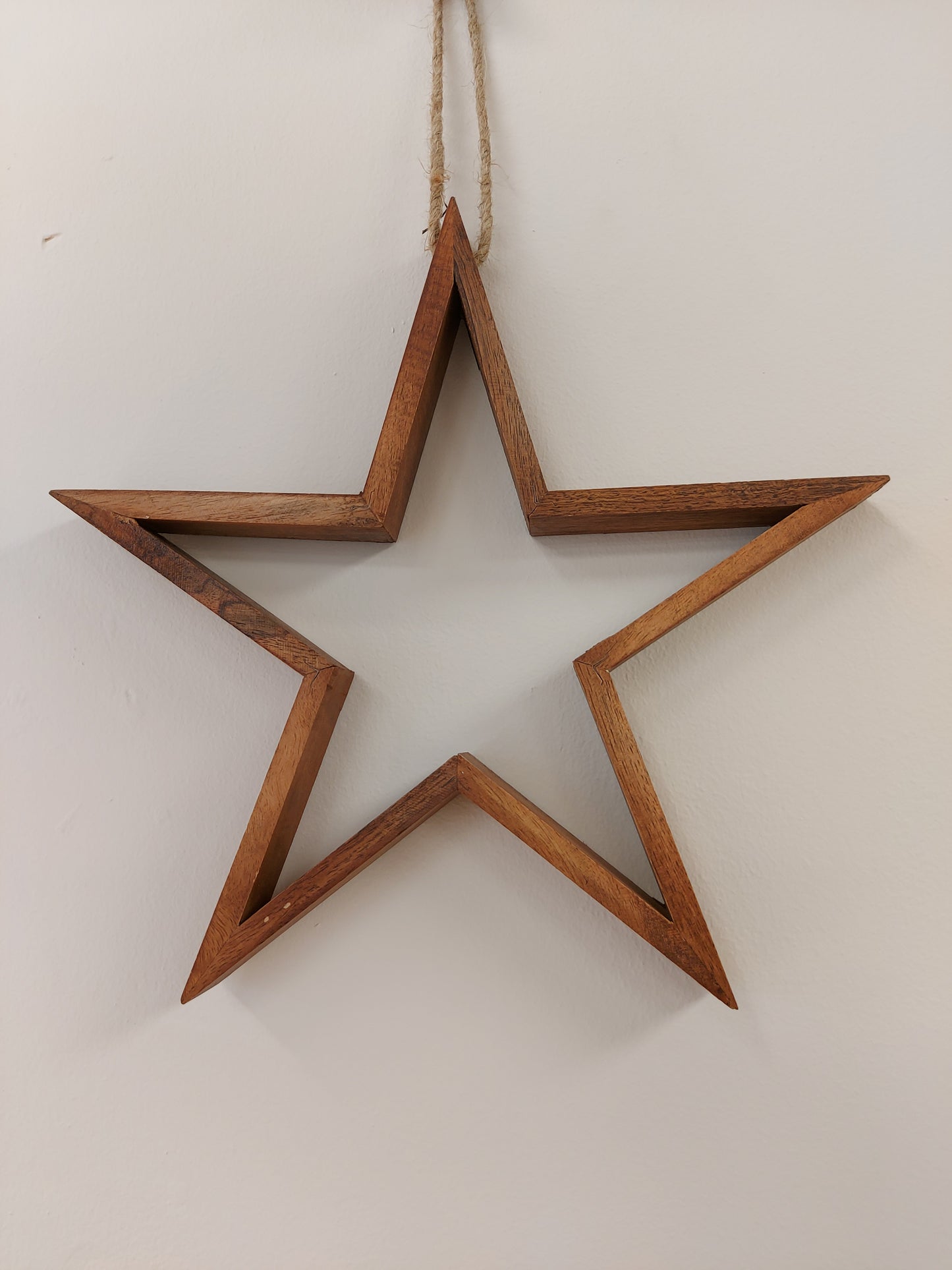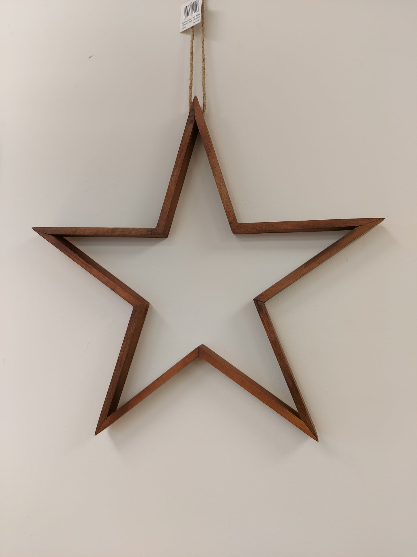 A chic rustic style star frame decoration in a natural finish with a decorative hanging rope for the option as a wall hanging decoration.